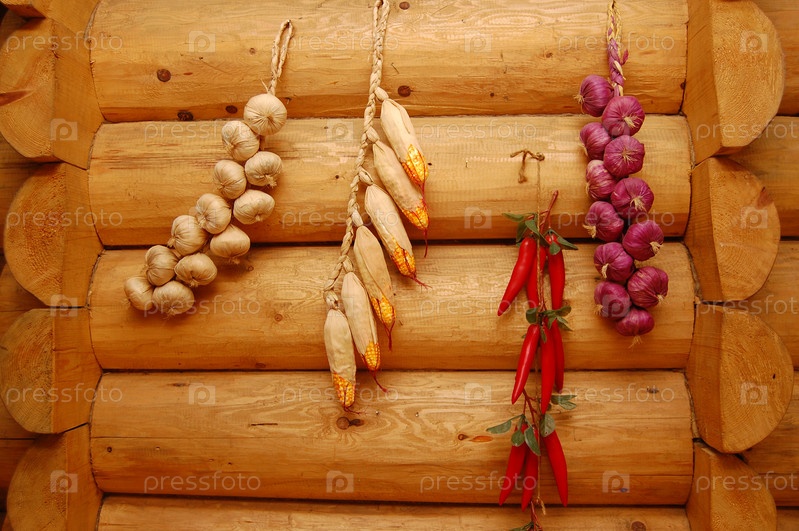 Связки сушеных овощей на бревенчатой стене