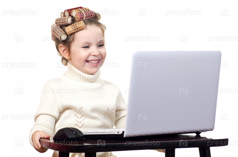 Маленькая девочка с бигуди на голове сидит за компьютером, изолирована на белом