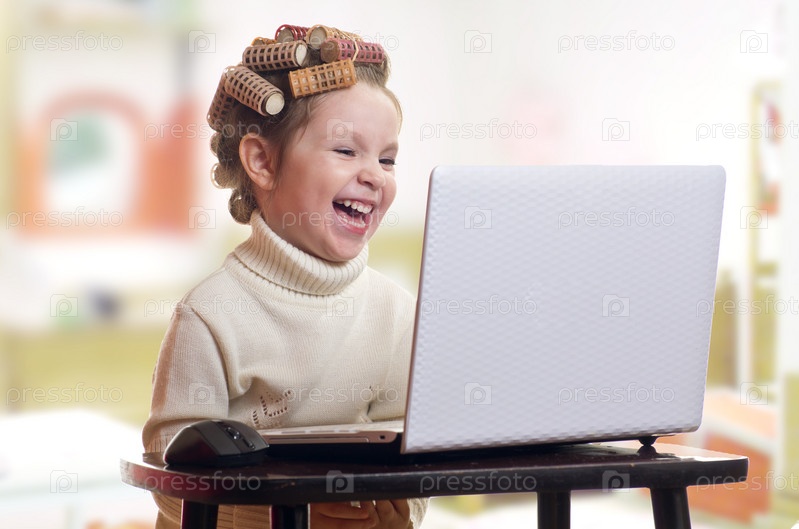 Маленькая девочка с бигуди на голове сидит за компьютером, изолирована на белом