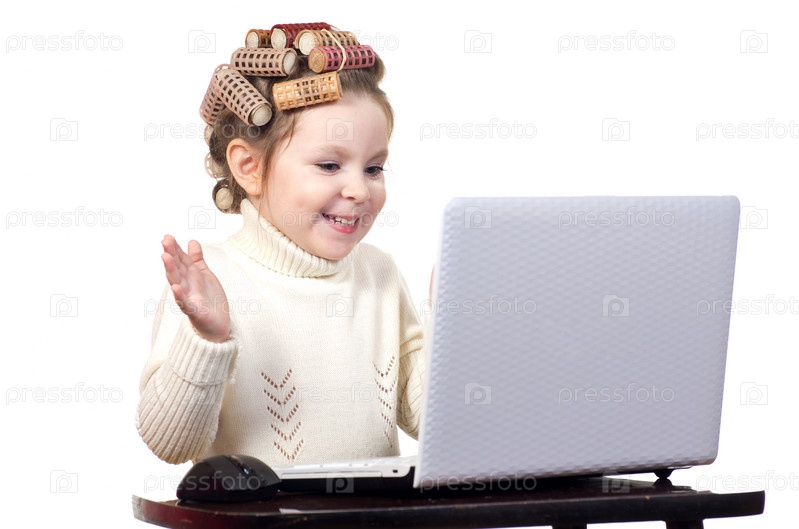 Маленькая девочка с бигуди на голове сидит за компьютером, изолирована на белом