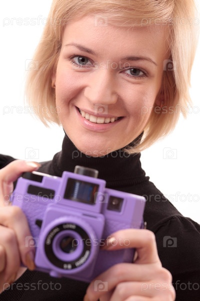 Молодые женщины с фиолетовой камерой изолированы на белом фоне