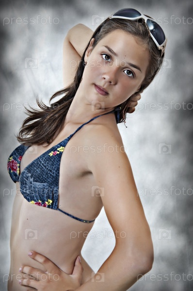 Молодая женщина в купальнике на сером фоне