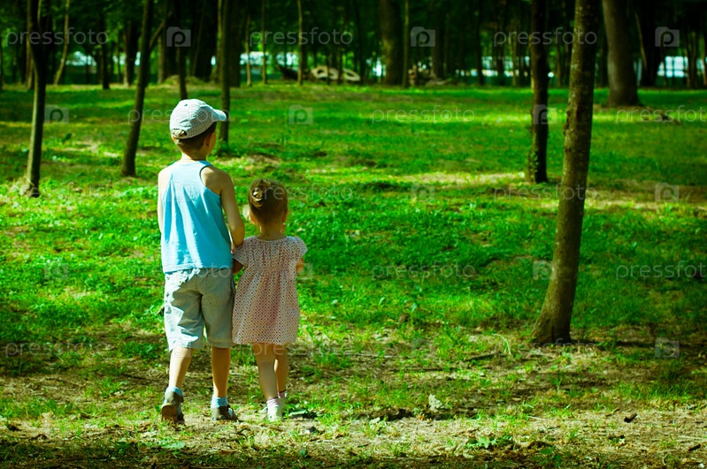 Мальчик и девочка гуляют в парке