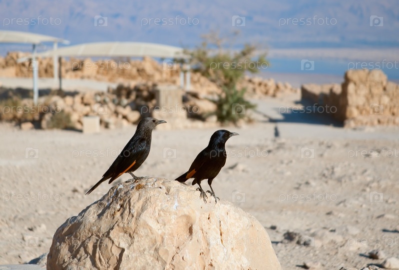 Пара тристрамовых скворцов на фоне руин Масады