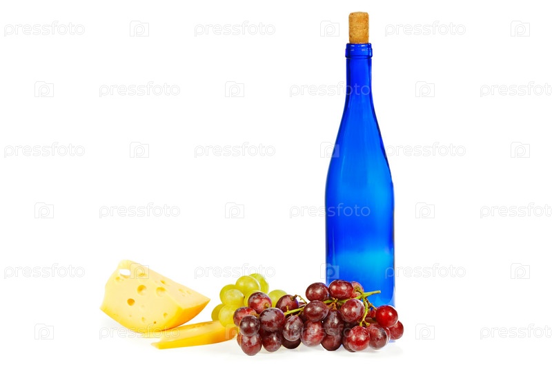 Синяя бутылка, виноград и сыр на белом фоне
