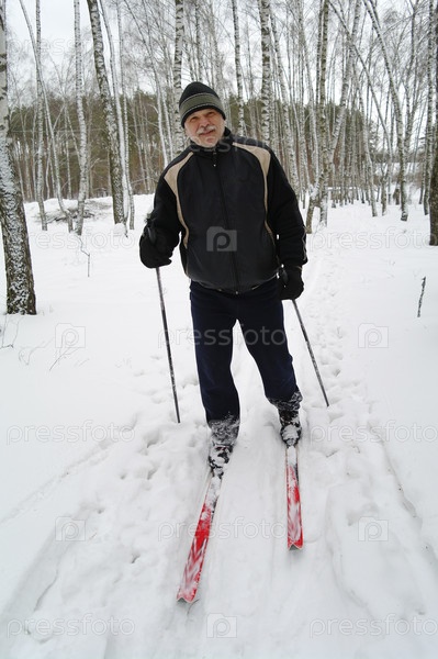 Портрет пожилого мужчины в спортивном костюме зимой в парке