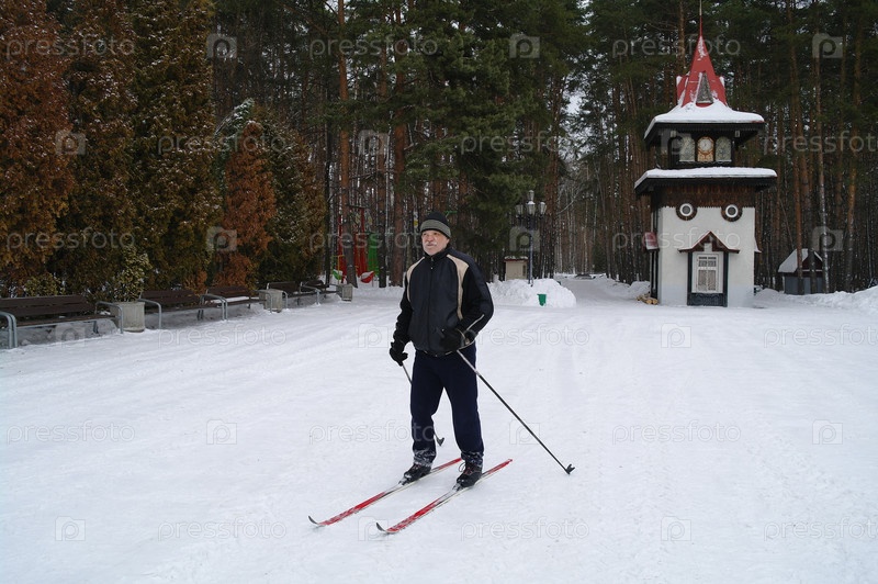 Портрет пожилого мужчины в спортивном костюме зимой в парке