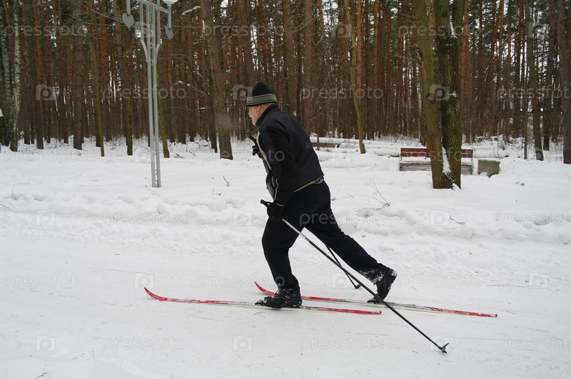 Портрет пожилого мужчины в спортивном костюме зимой в парке
