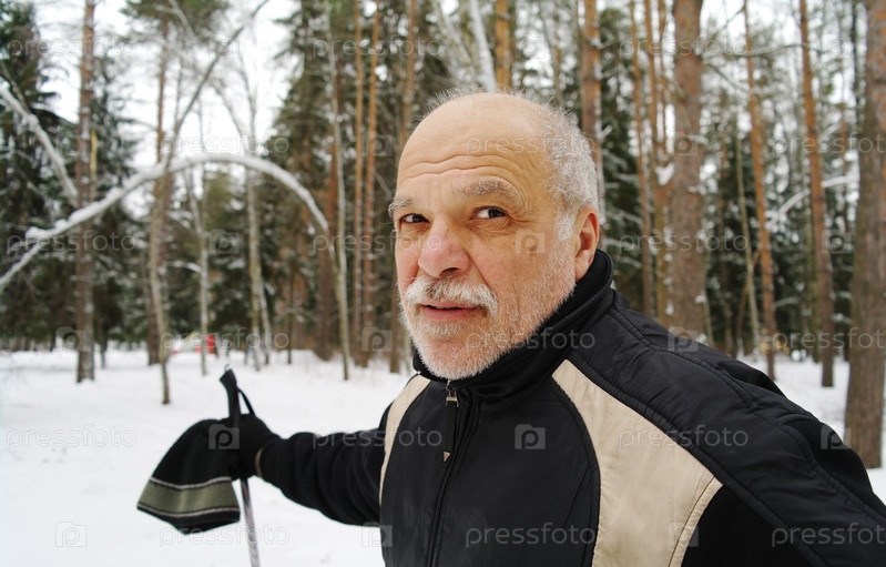 Портрет пожилого мужчины в спортивном костюме зимой в парке