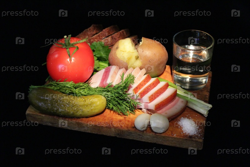 Овощи, зелень и нарезанное сало на кухонной доске, черный фон