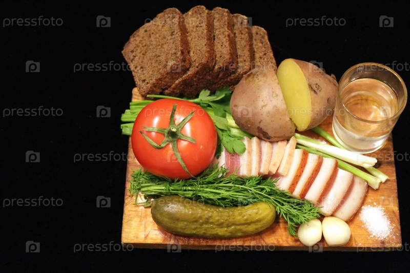 Различные продукты для приготовления обеда на кухонной доске, черный фон