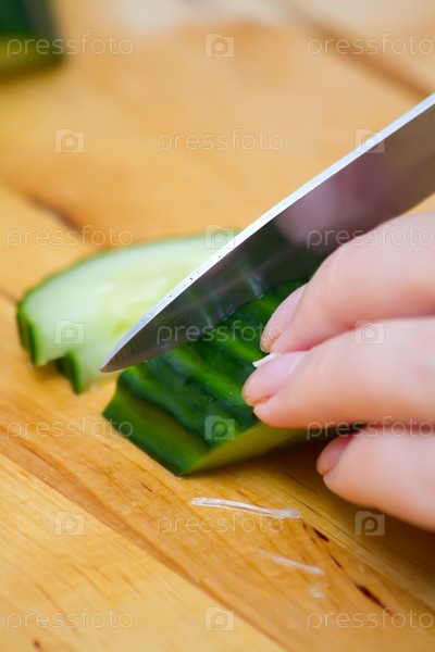 Женская рука с ножом режет огурец на кухонной доске