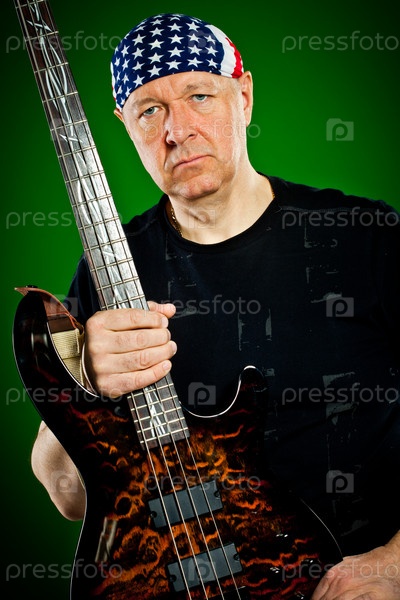 Музыкант с гитарой на зеленом фоне