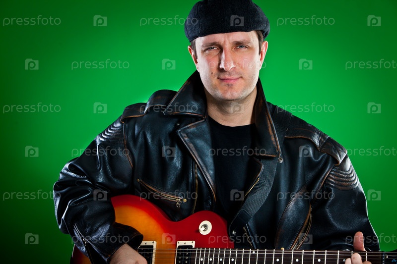 Музыкант с гитарой на зеленом фоне