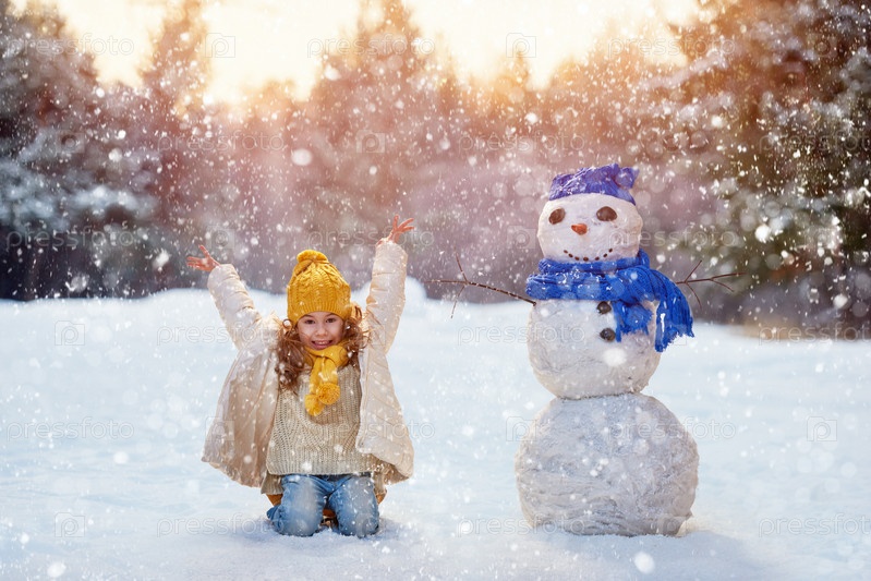 Девочка играет со снеговиком