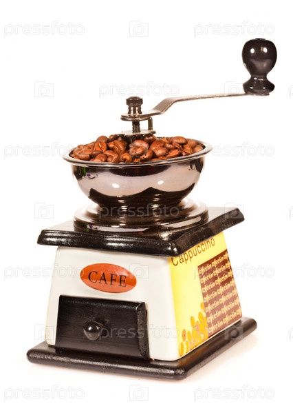 Ручная старинная кофемолка, наполнена кофе в зернах
