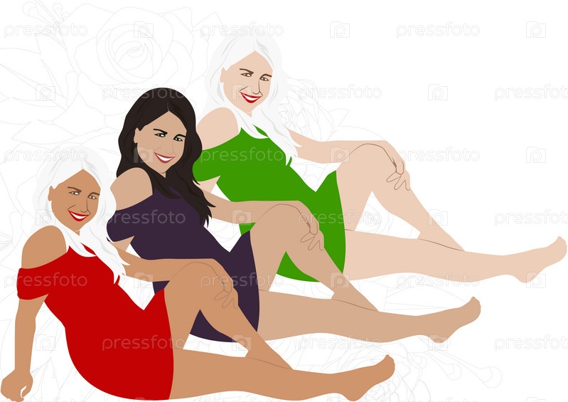 Три улыбающиеся девушки в платьях разных цветов сидят на белом фоне