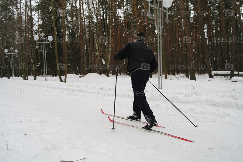 Пожилой мужчина катается на беговых лыжах в зимнем парке, Московская область