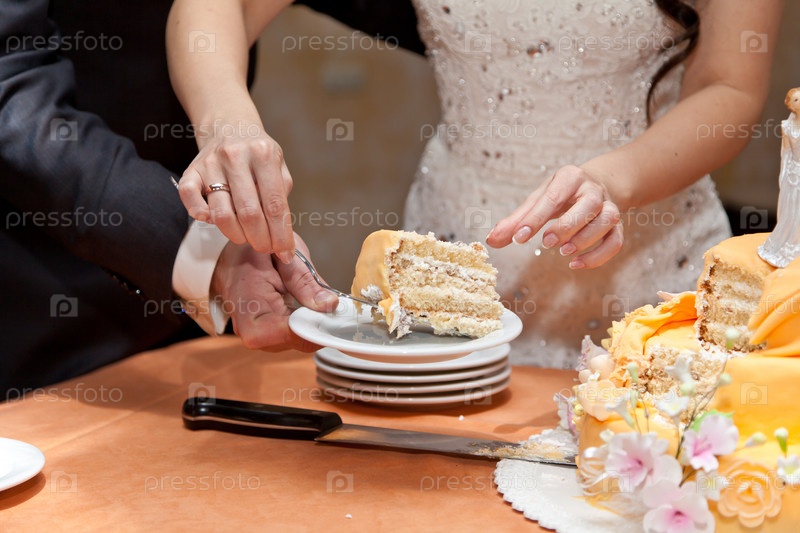 Жених и невеста режут свадебный торт