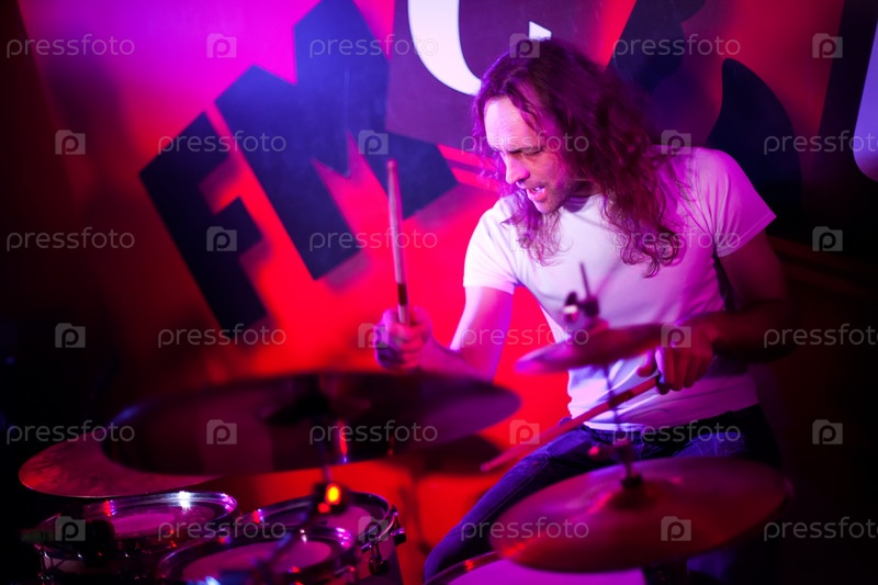 Музыкант играет на барабанах на сцене