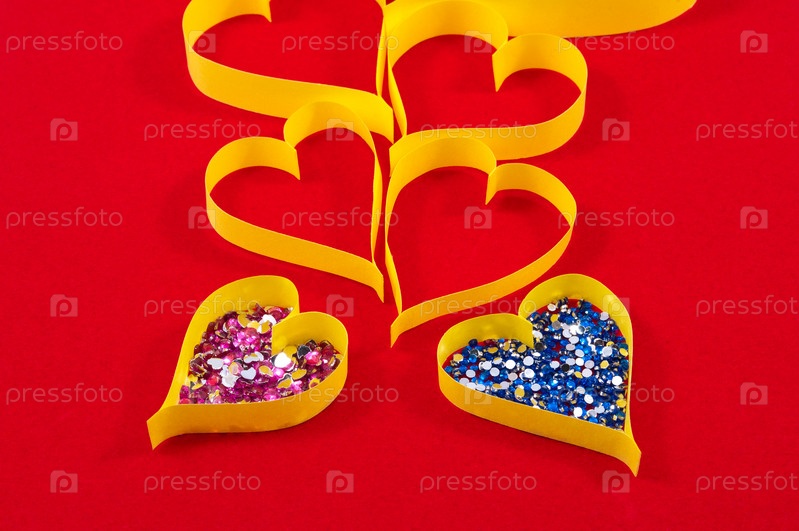 Бумажные сердца с блестками на красном фоне