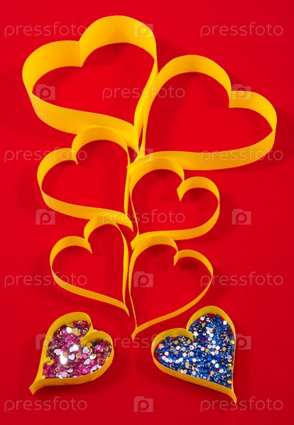 Бумажные сердца с блестками на красном фоне