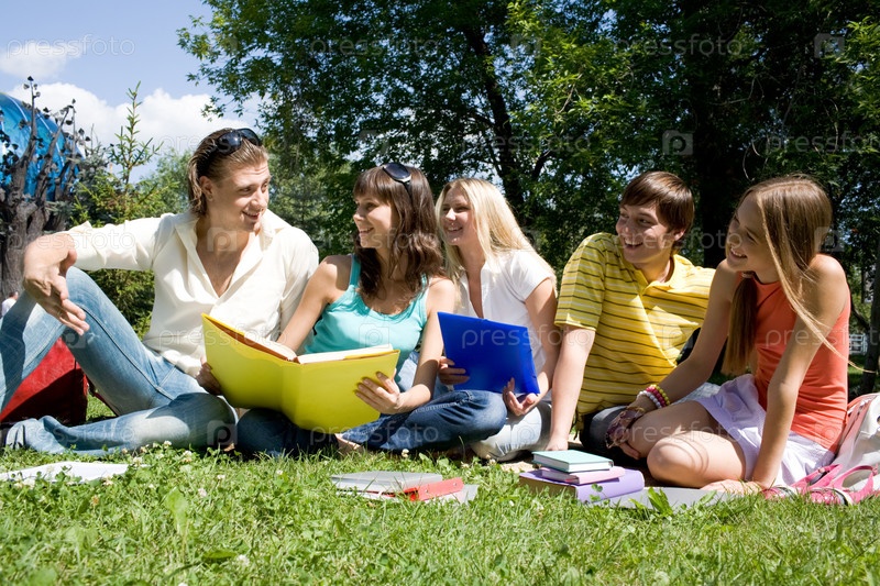Портрет веселых друзей, которые вместе разговаривают и читают книги в парке