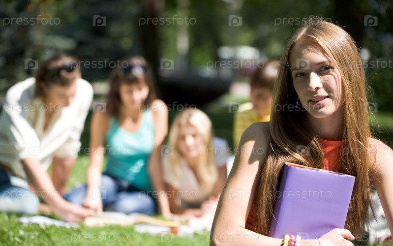 Портрет веселой девушки с книгой в руках, смотрящей на камеру на фоне своих друзей