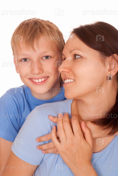 Мать держит сына и улыбается на белом фоне