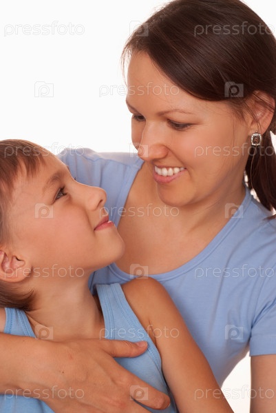 Счастливая мать обнимает сына и смотрит на него с нежностью