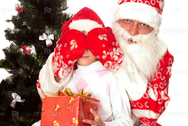 Санта-Клаус дарит подарки счастливому ребенку