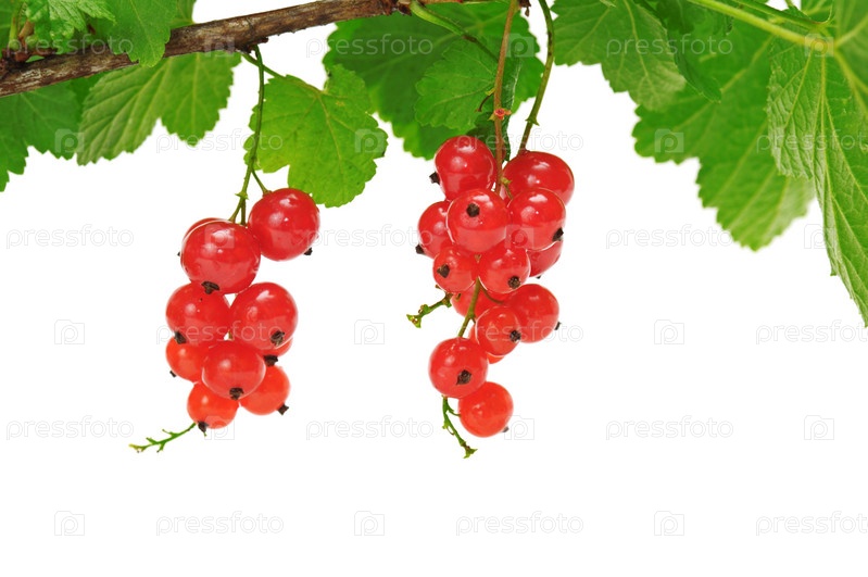 Ветка красной смородины с красными ягодами и зелеными листьями на белом фоне