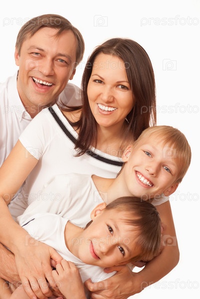 Счастливая семья из четырех человек на белом фоне