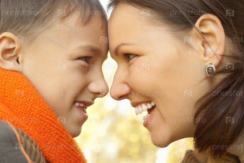 Счастливая мать и сын смотрят друг на друга, соприкасаясь лбами