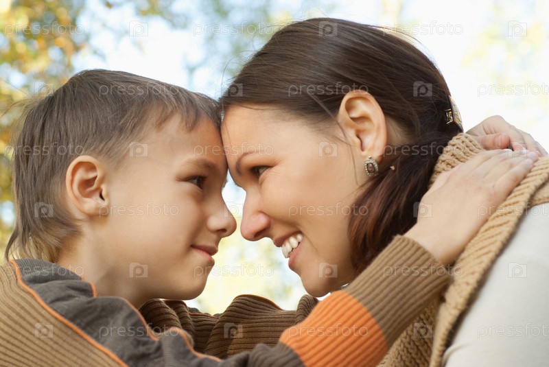 Мать и сын, соприкасаясь лбами, смотрят друг на друга