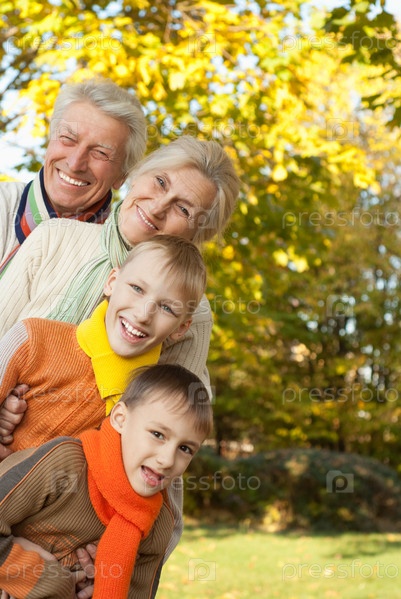 Портрет счастливых бабушки с дедушкой и внуков на природе