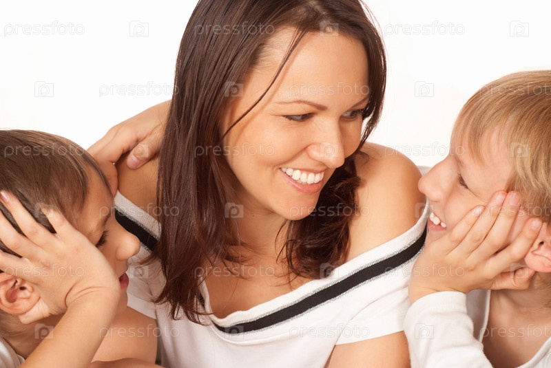 Милая мама с двумя своими детьми на светлом фоне