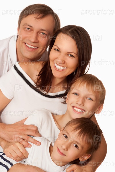 Счастливая семья из четырех человек на белом фоне