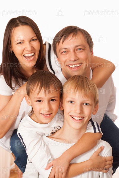 Счастливая семья из четырех человек на белом фоне