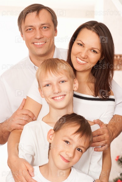 Счастливая семья из четырех человек на светлом фоне