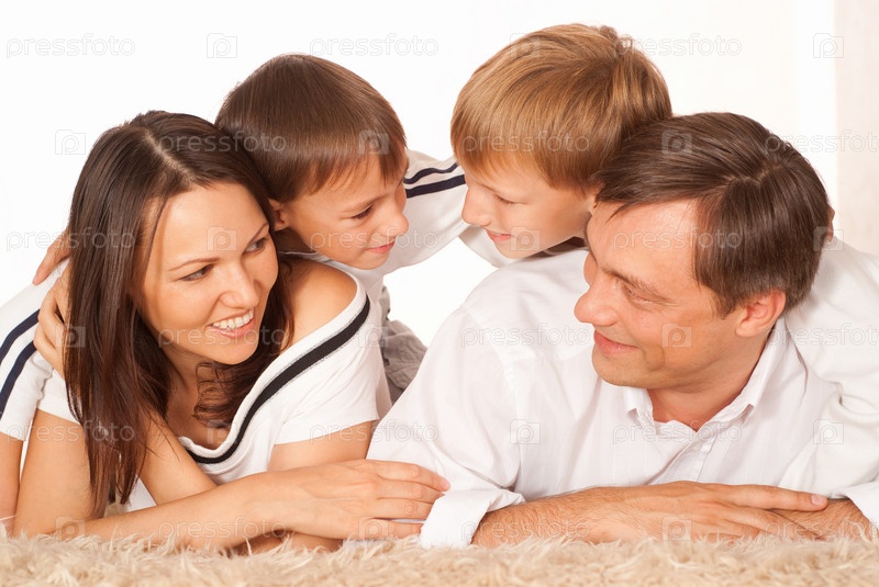 Дружная семья из четырех человек на светлом фоне