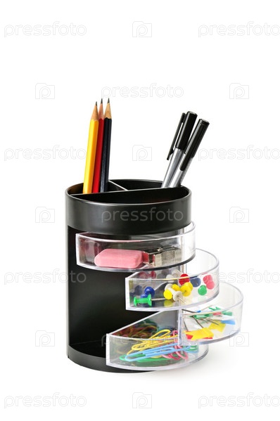 Канцелярские принадлежности в подставке на белом фоне