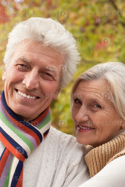 Счастливая пожилая пара в осеннем парке