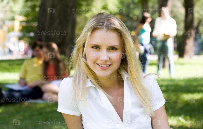Портрет привлекательной молодой женщины, смотрящей на камеру в парке