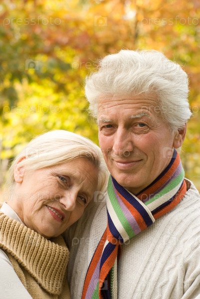 Пожилая супружеская пара гуляет в осеннем парке