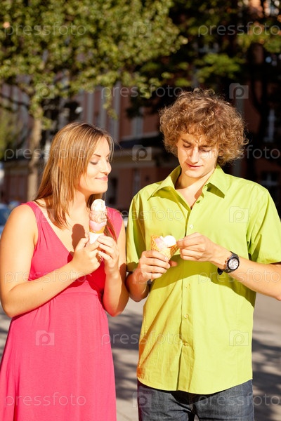 Девушка и юноша с мороженым идут по улице