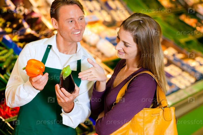 Продавец в супермаркете помогает девушке выбрать продукты