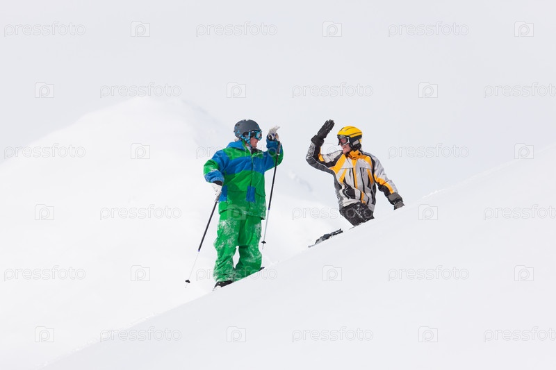 Горнолыжники стоят на вершине снежной горы