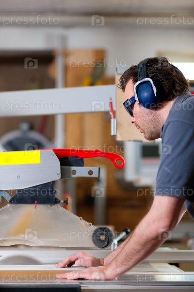 Мужчина, распиливающий деревянную доску на станке