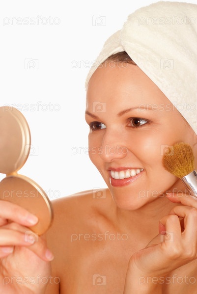 Красивая молодая женщина с полотенцем на голове делает макияж